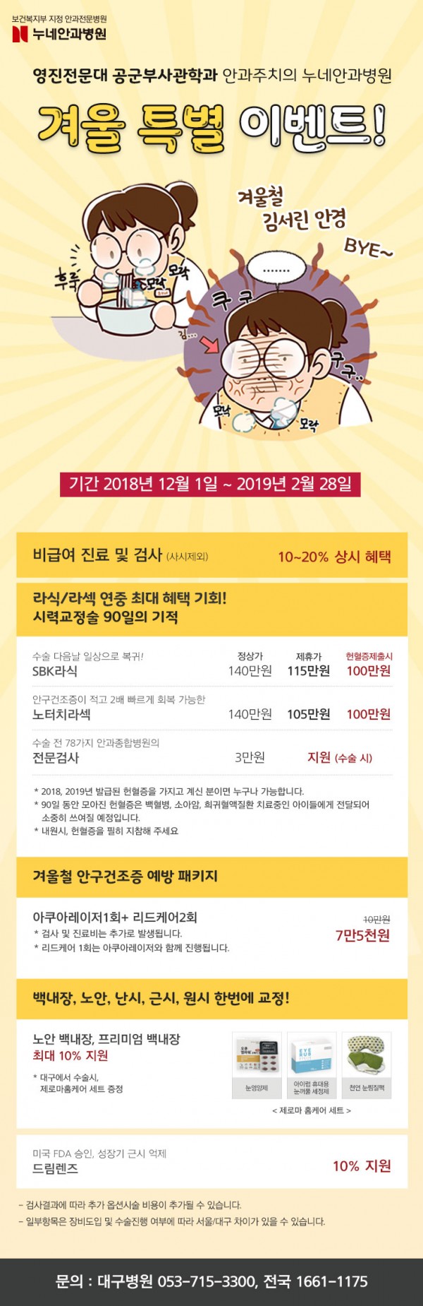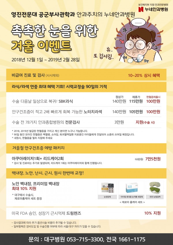 협약안과 겨울 시즌 제휴 혜택 안내 18-12-24 10:55 | 조회3,607 | 학군단관리자 영진전문대 공군 부사관 학군단과 협약되어 있는 누네안과에서 겨울시즌을 맞이하여 이벤트를 마련하였기에 학군단 후보생 및 졸업생에게 알려 드립니다. 댓글목록 등록된 댓글이 없습니다. < 이전글 다음글 > 목록